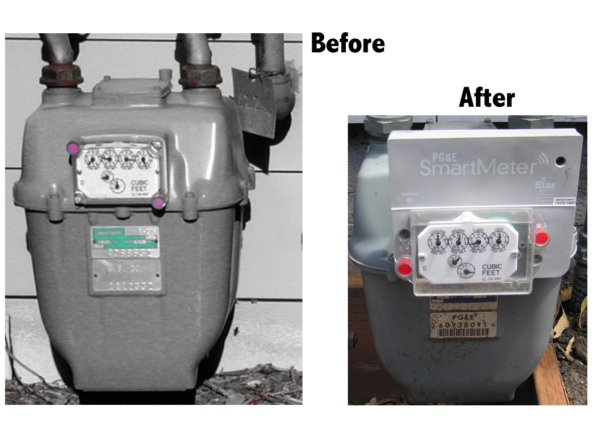 “The Aclara Star system is what PGE uses—in the 400MHz range, with each unit reporting to an antenna within a mile. Usually there are 2 antennas a unit can connect with. They are one-way only with no remote shut-off possible. PG&E’s pulse 4x a day (or thereabouts). The transmitting unit is placed onto an existing gas metering unit. They remove the dial portion, affix it to the grey “smart” unit, then replace it onto the gas unit (baffle, I think it’s called).”